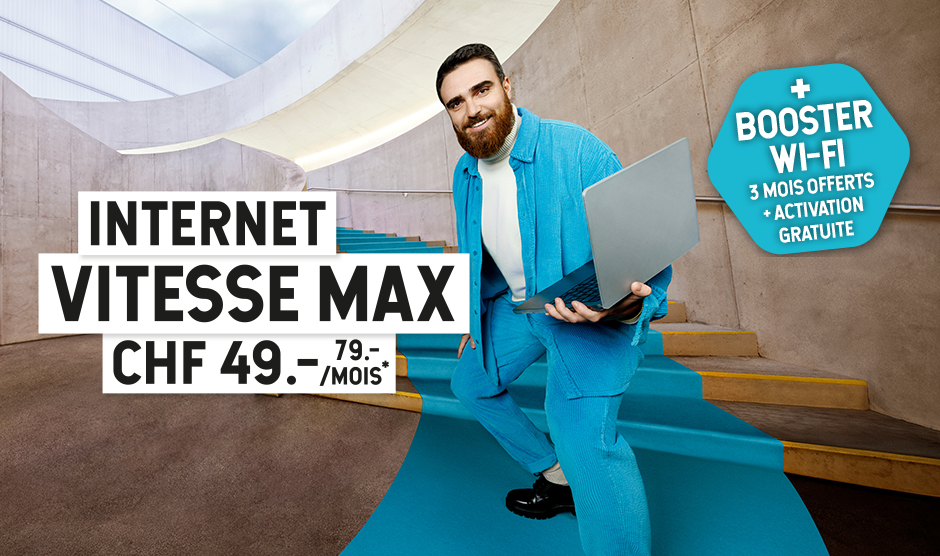 Jusqu’au 20 avril, Internet Smart (400 Mbit/s) et Internet Vitesse max (1 Gbit/s) sont proposés au prix promotionnel de CHF 49.- par mois pendant 12 mois*.